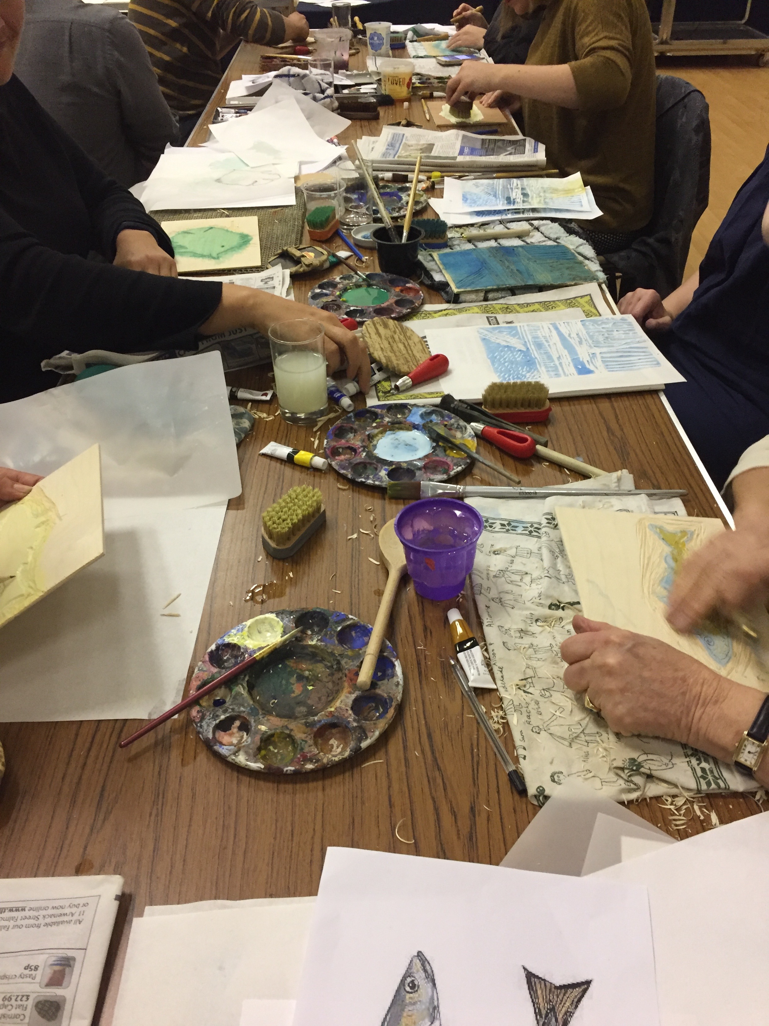 Adrian taught woodblock printing techniques and shared the history of traditional Japanese woodblock. He provided tools and instruction, with participants each taking home a series of prints.