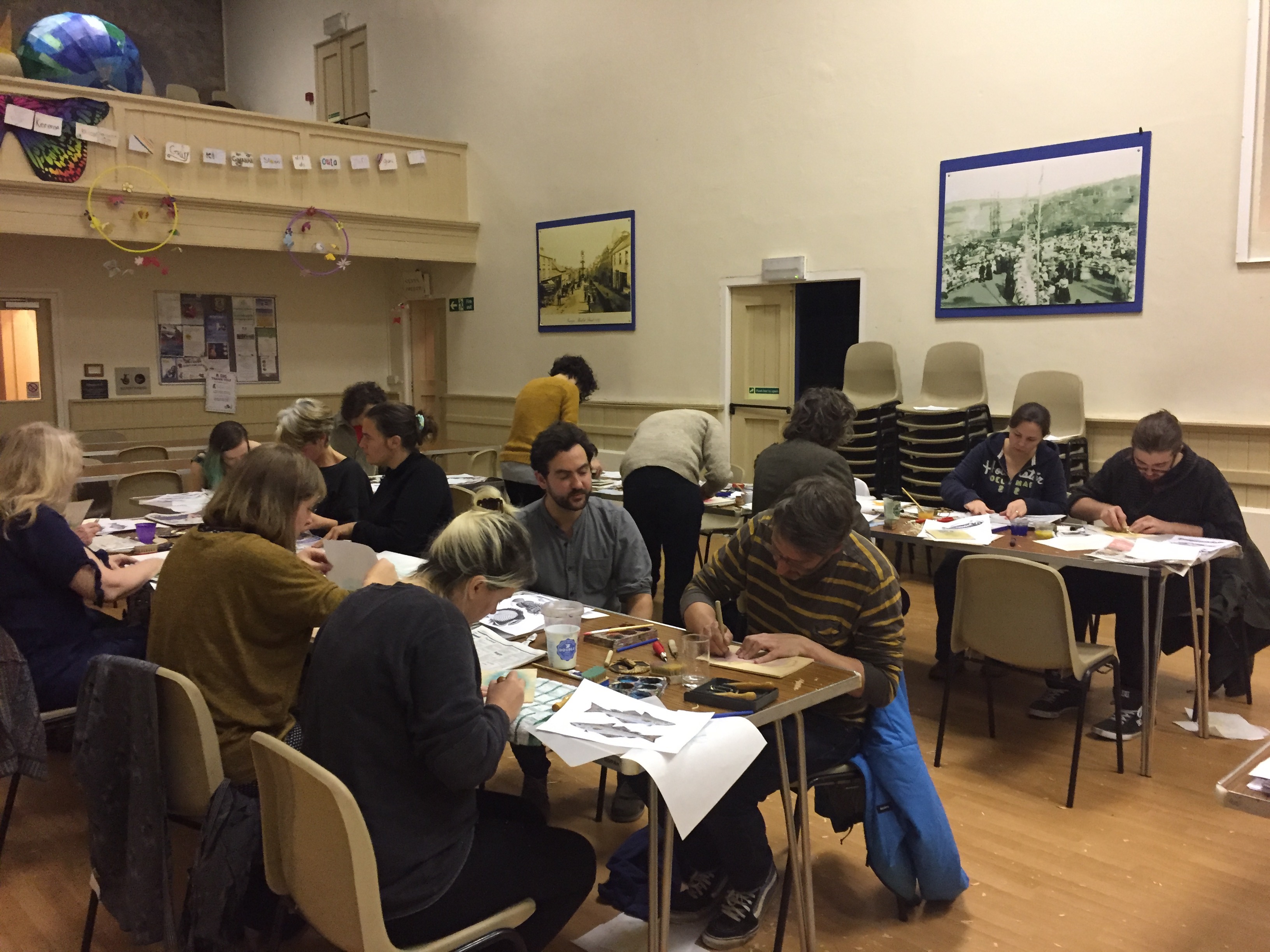Photos: Field NotesIn 2017 Field Notes re-envisaged the Penryn Arts Festival as a celebration of the creative practices of the town’s many resident artists and makers, and as an opportunity to share skills and interests. Throughout autumn and winter, a series of free artist led workshops and dinners took place in the Temperance Hall, in the centre of the town, providing opportunities for residents from different generations and communities to converse, learn skills and engage in creativity.